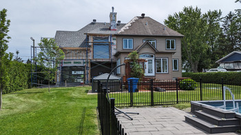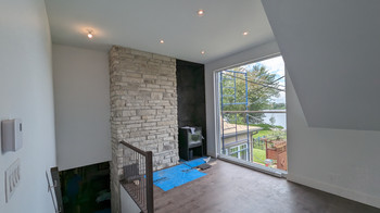 Agrandissement majeur d'une résidence situé au bord du Richelieu. Deux garages sont ajoutés au rez-de-chaussée. À l'étage, une chambre, une salle de divertissement et un espace lounge est aménagé.